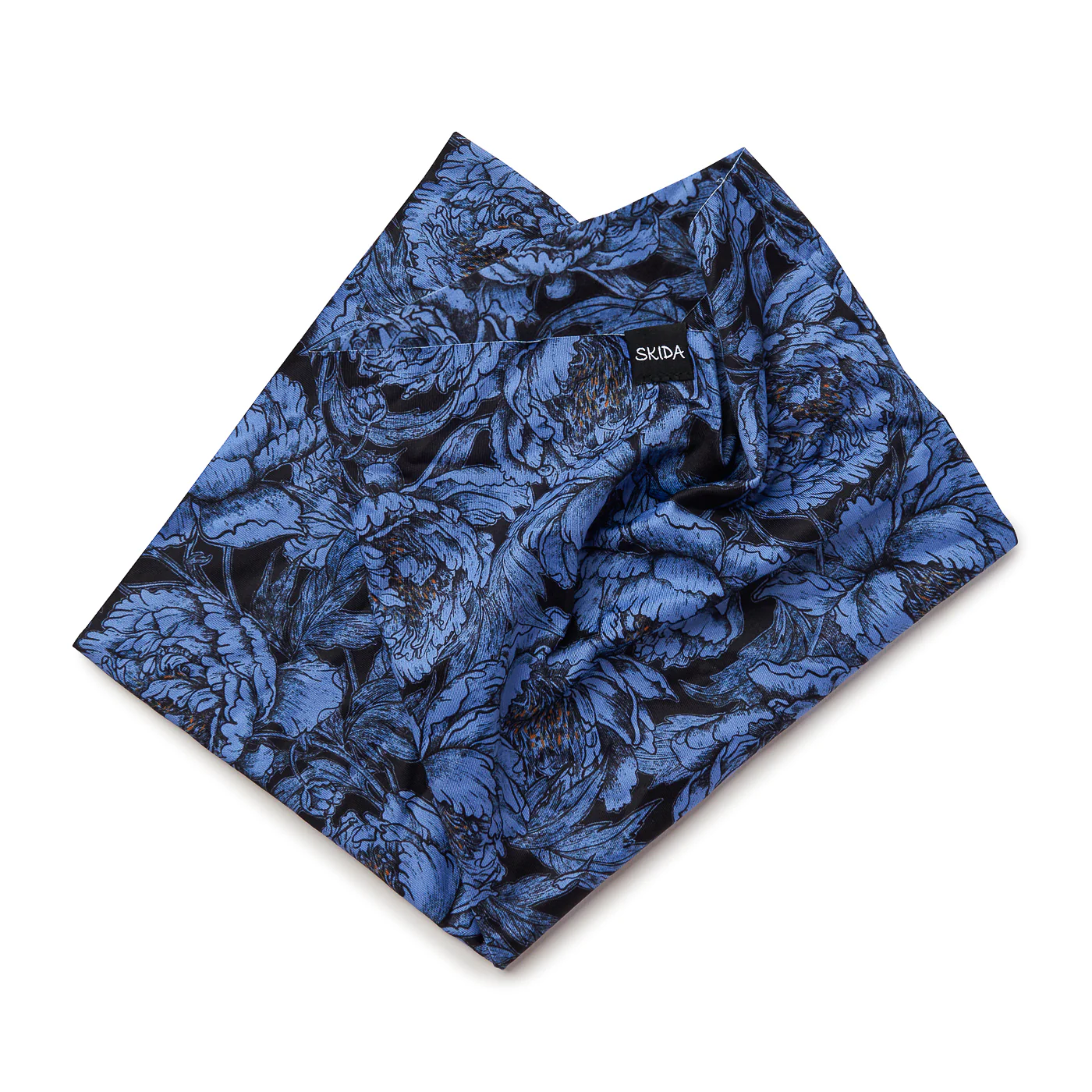 Moody and mesmerizing, Sapphire showcases a dense bloom of hand-drawn peonies in rich, cornflower blue, unfolding across a shadowy backdrop. Delicate orange accents add depth and dimension, giving each petal a painterly touch.